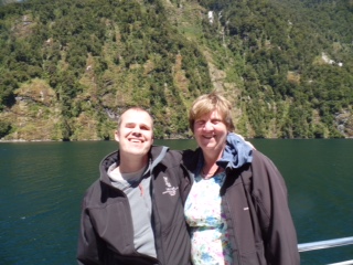 Onderweg van Invercargill naar Te Anau veel koeien en schapen gezien. Het gebied was heuvelachtig en niet veel bebouwing. Het begon te regenen tijdens de busreis en bij aankomst in Te Anau was het nog een beetje aan het miezeren en waterkoud. Gelukkig hoefden we niet ver te lopen naar ons motel. ’s Avonds heelijk bij de pizzeria gegeten. Voor Leo uniek: een glutenvrije pizza salami en voor Brigit de calzone. Maandag werden we laat wakker en was het weer volledig omgeslagen: zon en strakblauwe hemel. Op gemak Te Anau verkend, wasjes gedraaid en gelezen. Dinsdag moest de wekker weer gezet worden voor een prachtige excursie. Via een boottocht over Lake Manapouri en een bustochtje van 25 minuten kwamen we aan bij de Doubtful Sound, één van de bekende fjorden. We hadden weer een strakblauwe lucht. Wat boffen wij toch deze vakantie. De uitzichten waren mooi. Veel begroeide bergen, maar ook kale bergtoppen met sneeuw. Het water was zo kalm dat we zelfs de Tasmanzee zijn op gegaan. Dat schijnt niet vaak voor te komen. Ook nog zeehonden en dolfijnen gezien, gehoord en geroken. Wat een feest! Wat heel bijzonder was dat we in een baai een paar minuten hebben rondgedobberd met de motor uit. Iedereen was muisstil, er werden geen foto’s gemaakt en Leo heeft de stilte ‘stiekem’ opgenomen. Weer een unieke natuurbelevenis. Vandaag hebben we nog heerlijk 3 uur gewandeld langs Lake Te Anau. Nu zitten we in de bus naar Queenstown. Morgen weer een letterlijk hoogtepunt van onze reis. Leo gaat van 5km hoogte een parachute(tandem)sprong maken. Brigit blijft met beide benen op de grond. Spannend en leuk!